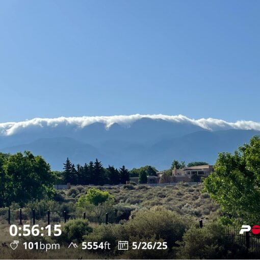 It’s March 25th, 2025, and the Sandia Mountains loom ahead of me as I head east for an out and back from my house that was primarily dirt. The Sandias tower over Albuquerque at over 10,000′ and provide endlessly changing views. In the first image is the Albuquerque LDS Temple, and in the second is Mt. Taylor, another 10,000′ mountain, about 60 miles to the west.