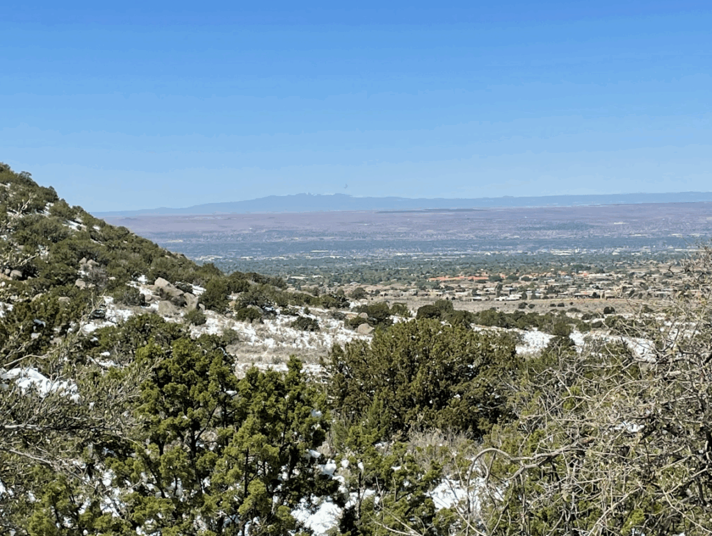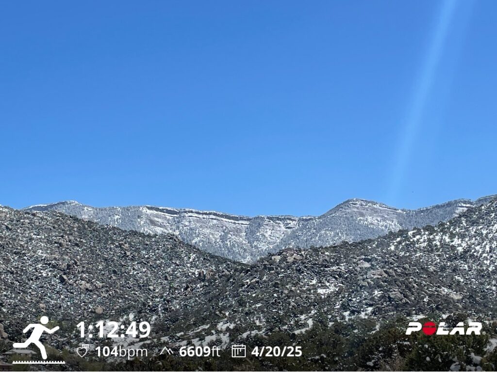 My normal Saturday adventure run was postponed because of the weather, but I was rewarded with a winter wonderland in the Sandia Mountain Foothills. I drove the 10:00 to the Michael Emery Trail parking lot, parked, and started heading east toward the Sandias, which were beautifully snow-covered. The trails were beautifully clear in the beginning, but as I continued to head east and up there were more and more sections on the trail with snow in the shade. I did a loop, and at the easternmost top of the loop, the snow had probably been about 4″ earlier. I checked and there was 6-12″ at 10,000’+ on the crest.
